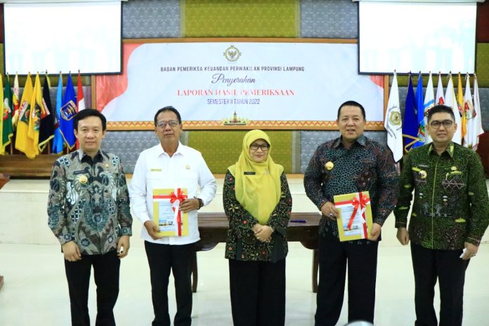 Gubernur Arinal Djunaidi menghadiri acara Penyerahan Laporan Hasil Pemeriksaan (LHP) BPK Perwakilan Provinsi Lampung Semester II Tahun 2022, di Kantor BPK RI Perwakilan Provinsi Lampung, Jumat (20/1/23).