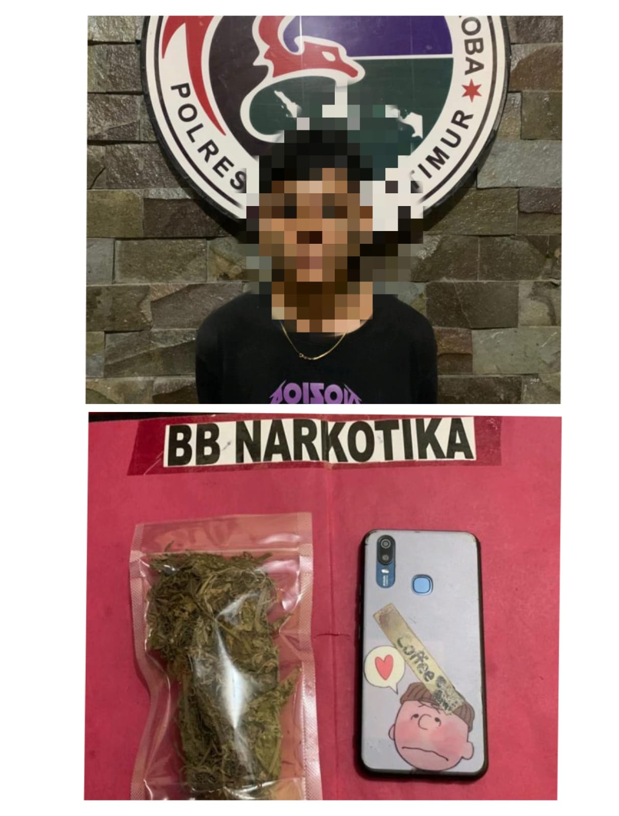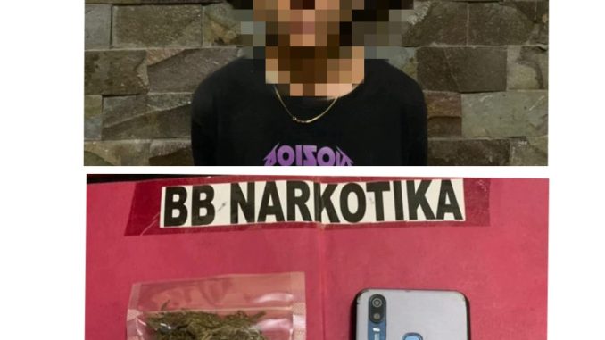 Kapolres menambahkan dari hasil penangkapan, petugas Kepolisian melakukan penggeledahan badan serta tempat ditemukan barang bukti berupa 1 (Satu) Buah plastik klip bening yang didalamnya berisikan bahan daun kering batang serta biji yang diduga keras Narkotika golongan I dalam bentuk tanaman jenis ganja dengan berat Bruto 3.82 Gram dan 1 bauh telepon genggam.