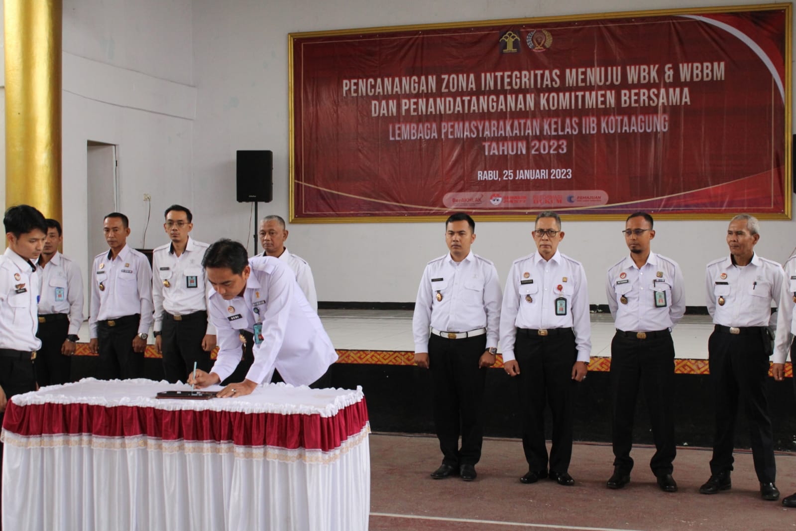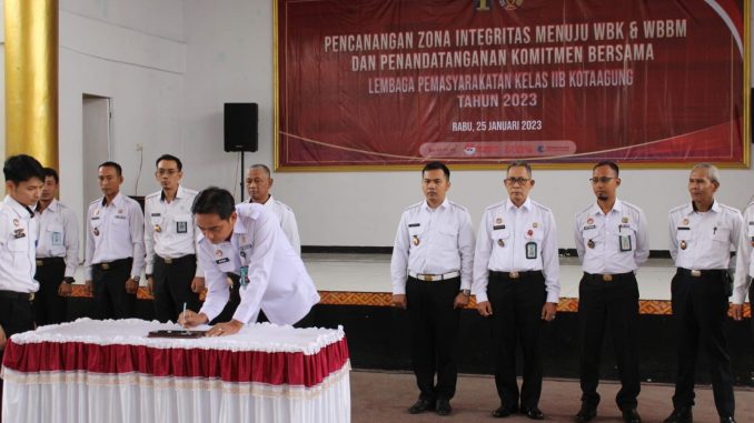 Seluruh Petugas Lembaga Pemasyarakatan (Lapas) Kelas IIB Kotaagung lakukan Penandatanganan Komitmen Bersama dalam rangka Pencanangan Pembangunan Zona Integritas Menuju Wilayah Bebas Korupsi/Wilayah Birokrasi Bersih Melayani (WBK/WBBM) Tahun 2023 pada Rabu (25/1/2023).