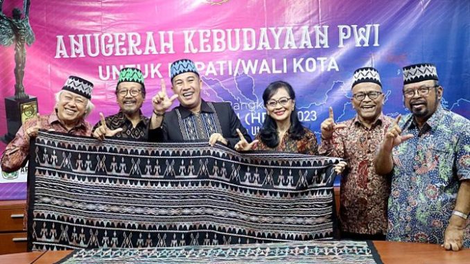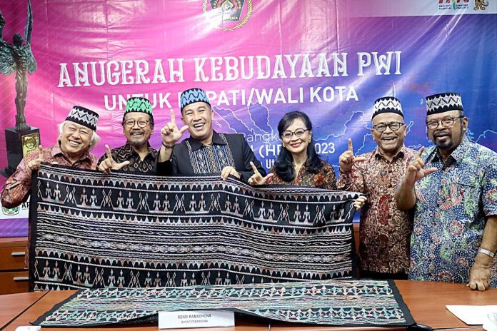“Pemerintah Daerah Pesawaran mengenalkan produk kerajinan sulam jelujur pada event Indonesia Fashion Week di New York dengan tema Sang Dewi,” kata Bupati Dendi dengan bangga di depan Tim Juri Anugerah Kebudayaan PWI Pusat 2023 di Kantor PWI Pusat, Kebon Sirih, Jakarta Pusat. Dendi terpilih menerima anugerah tersebut.