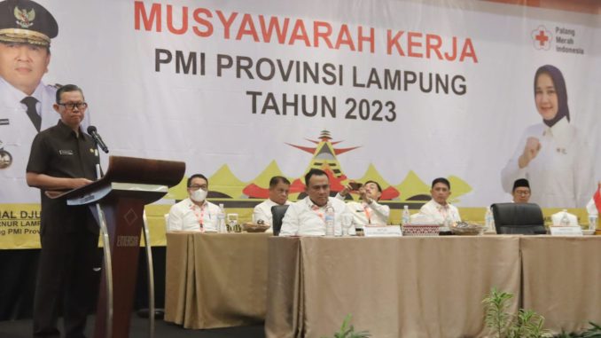 Bandar Lampung — Sekretaris Daerah Provinsi Lampung, Fahrizal Darminto membuka acara Musyawarah Kerja (Mukerprov) PMI Provinsi Lampung dan Kick Off JUMBARA Palang Merah Remaja Tingkat Nasional IX Tahun 2023 di Hotel Emersia, Senin (13/2/2023).