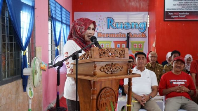 Ketua Tim Penggerak Pemberdayaan Kesejahteraan Keluarga (TP PKK) Kabupaten Lampung Selatan, Hj. Winarni Nanang Ermanto mengikuti kegiatan Peningkatan Pemberdayaan Perempuan, Selasa (21/02/2023).