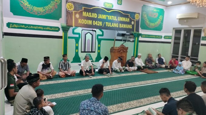 Menggala (Tulang Bawang) – Dalam rangka meningkatkan keimanan dan ketaqwaan kepada Allah SWT, Anggota Kodim 0426 Tulang Bawang melaksanakan Yasinan setiap malam Jumat yang dilaksanakan di Masjid Jamiyatul Ummah Makodim, Jln. Lintas Timur Sumatra, Km. 113, Kampung Bujung Tenuk, Kecamatan Menggala, Kabupaten Tulang Bawang, Kamis Malam 23 Februari 2023.