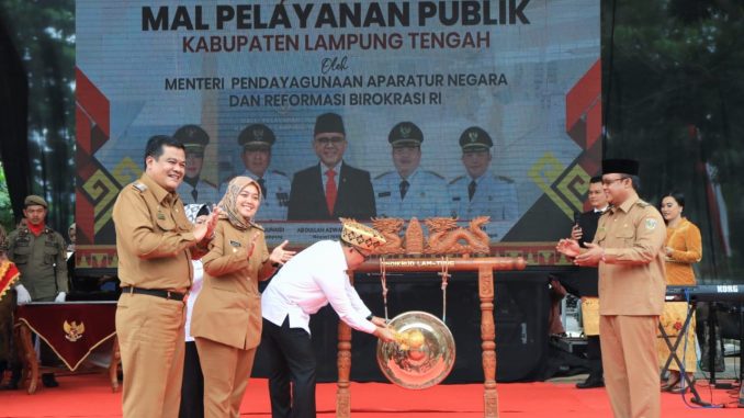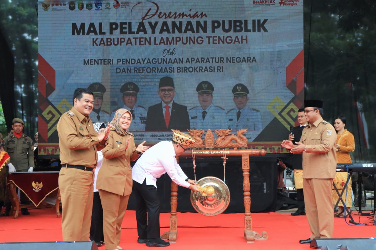 Peresmian Mall Pelayanan Publik Kabupaten Lampung Tengah ditandai dengan Pemukulan Gong oleh Menpan-RB disaksikan oleh Wakil Gubernur Lampung Chusnunia, Bupati Lampung Tengah, Wakil Bupati Lampung Tengah dan Deputi Bidang Pelayanan Publik Diah Natalisa dilanjutkan dengan penandatanganan prasasti dan pemotongan pita dipintu masuk gedung Mall Pelayanan Publik.