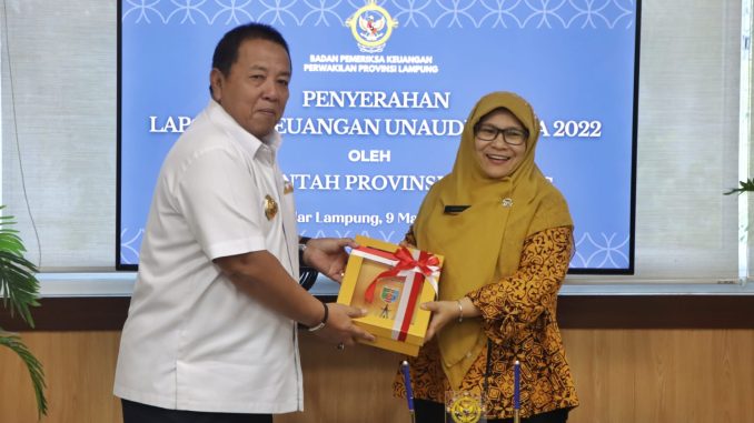 Bandar Lampung–Gubernur Lampung Arinal Djunaidi menyerahkan Laporan Keuangan Unaudited TA. 2022 Pemerintah Provinsi Lampung kepada Badan Pemeriksa Keuangan (BPK) Perwakilan Provinsi Lampung bertempat di Kantor BPK Perwakilan Provinsi Lampung, Kamis (09/03/2023).