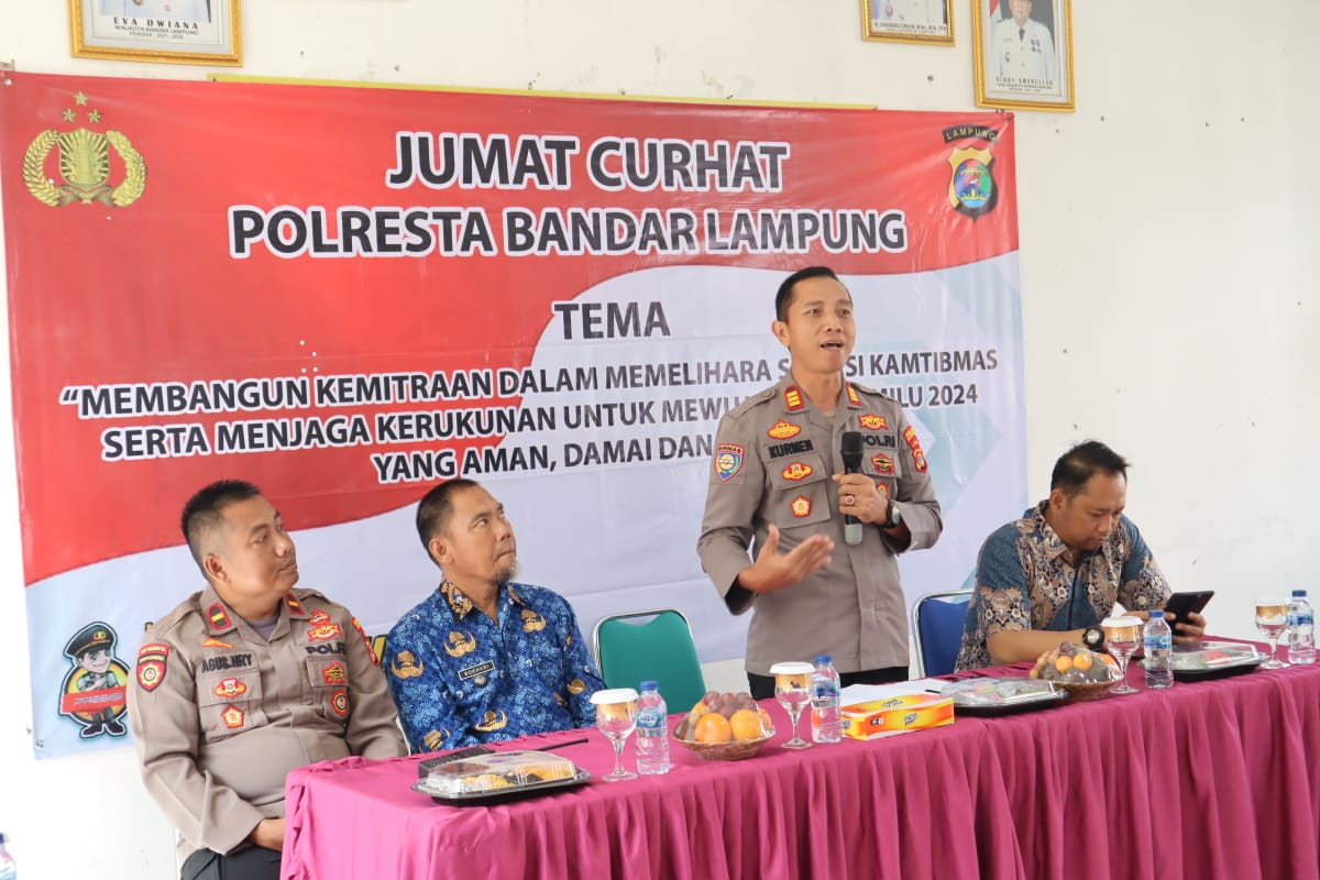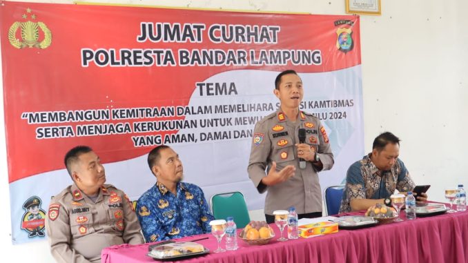 Dengan tema “Membangun Kemitraan Dalam Memelihara Situasi Kamtibmas Serta Menjaga Kerukunan Untuk Mewujudkan Pemilu 2024 yang Aman, Damai dan Sejuk”, Kapolresta Bandar Lampung Kombes Pol Ino Harianto, S.I.K, M.M., yang diwakilkan oleh Kasat Binmas Polresta Bandar Lampung AKP Kurmen Rubiyanto, S.H, M.H., menjelaskan bahwa kegiatan “Jumat Curhat” ini merupakan salah satu Progam Polri dalam rangka mempererat silaturrahmi dengan masyarakat, melaksanakan sosialisasi serta berdiskusi untuk mengetahui situasi kamtibmas dan merespon persoalan-persoalan yang ada di tengah masyarakat.