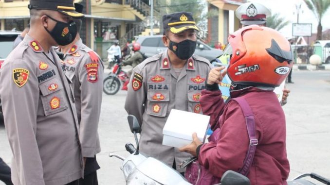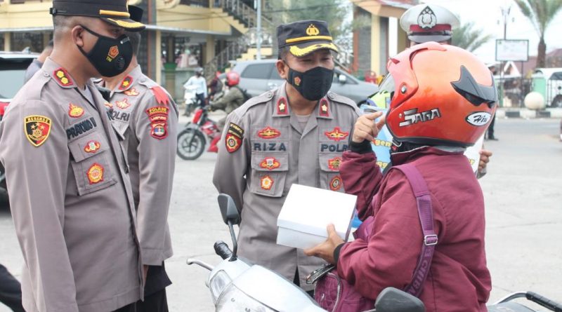 Disela-sela pembagian takjil, Kapolres Pesawaran memberikan himbauan kepada para pengendara agar berhati-hati dan selalu mematuhi peraturan lalu lintas demi terciptanya Kamseltibcar Lantas di Jalan Lintas Barat.