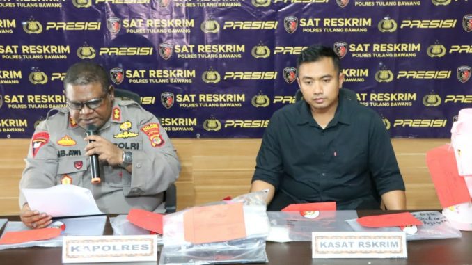 “Hari ini kami menggelar konferensi pers terkait keberhasilan ungkap kasus pembunuhan berencana yang dilakukan oleh seorang suami kepada istrinya sendiri. Pelaku ditangkap hari Kamis (30/03/2023), sekitar pukul 14.30 WIB, saat sedang berada di rumah mertuanya di Kampung Tri Dharma Wira Jaya, Kecamatan Banjar Agung,” kata Kapolres Tulang Bawang, AKBP Jibrael Bata Awi, SIK, yang didampingi Kasat Reskrim, AKP Wido Dwi Arifiya Zaen, SIK, MH, dan PS. Kanit Resum, Aiptu Robert H Purba, SH, MH, hari Jum’at (31/03/2023), sekitar pukul 13.30 WIB, di aula Mapolres setempat.