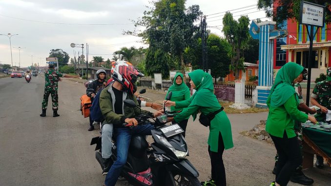 BANDAR LAMPUNG — Menjelang berbuka puasa Prajurit TNI Angkatan Darat dan Persit dari Koramil Kedaton Kodim 0410/KBL melaksanakan bagi-bagi Takjil. Sebanyak 140 Paket Takjil dibagikan kepada masyarakat pengguna jalan di Jln. Soekarno Hatta Kota Bandar Lampung, Minggu (9/4)