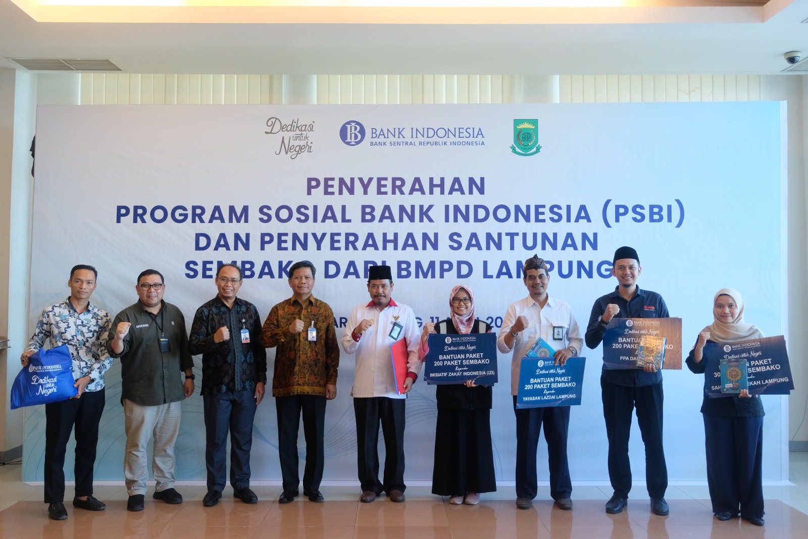 Dalam kegiatan tersebut, bantuan Program Sosial Bank Indonesia (PSBI) dan paket sembako BMPD tersebut telah diberikan secara simbolis kepada perwakilan penerima. Adapun bantuan tersebut selanjutnya diberikan terhadap tenaga kerja perbankan outsourcing seperti cleaning service, teknisi, supir, dan tukang kebun yang membutuhkan, warga Kampung Dipasena, warga Kampung Nelayan, warga Kampung Pemulung, Kelompok Tunanetra, Ustadz/Ustadzah dan santri yatim, serta fakir miskin/dhuafa (buruh harian lepas, tukang cuci, pegawai gaji harian).