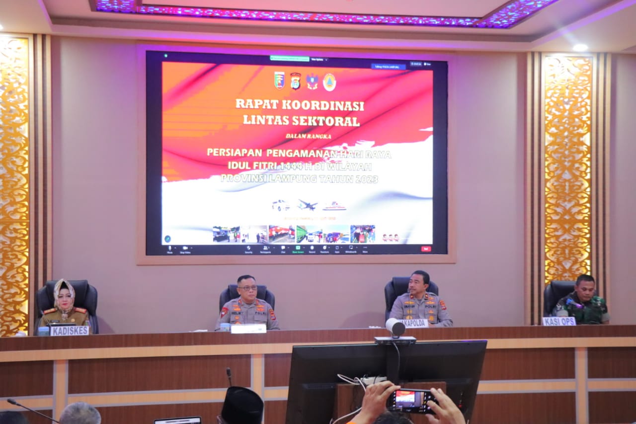 Lampung Selatan – Kapolda Lampung Irjen Pol Helmy Santika S.H.,S.I.K.,M.Si., bersama Wakapolda Lampung Brigjen Pol Dr Umar Effendi S.IK.,M.Si., Mengikuti Rakor Lintas Sektoral Dalam Rangka Kesiapan Pengamanan hari Raya Idul Fitri 1444 H, bertempat di Gedung Ruppatama Polda Lampung. Selasa (11/4/23)