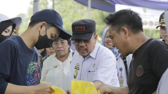 Pesawaran- Sekretaris Daerah Kab. Pesawaran Wildan, S.E,M.M. menghadiri acara Fasilitasi Kegiatan Pasar Murah Pemerintah Provinsi Lampung di Lapangan Bola Dusun Sri Agung Desa Bumi Agung Kec. Tegineneng pada Kamis ( 13/4/2023).