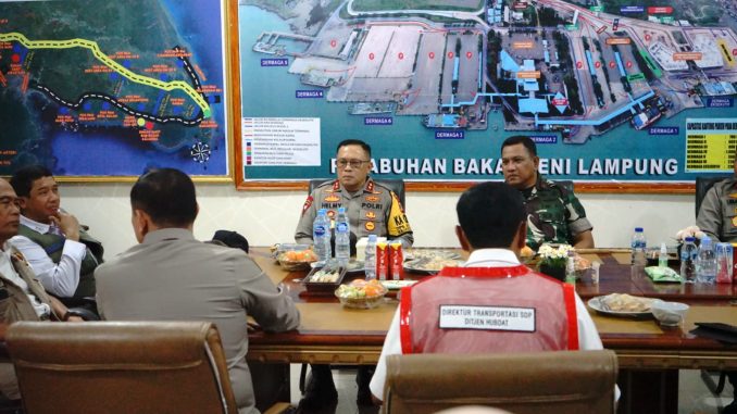 Lampung Selatan (Polda Lampung)— Kapolda Lampung Irjen Pol Helmy Santika bersama Wakapolda Lampung Brigjen Pol Umar Effendi, mendampingi Menko PMK (Menteri Koordinator Bidang Pembangunan Manusia dan Kebudayaan) Prof. Dr. Muhadjir Effendy dan Kabaharkam Polri Komjen Pol Fadil Imran dalam kegiatan pantauan arus balik lebaran 2023 di pelabuhan penyeberangan Bakauheni Lampung Selatan, Selasa (25/4/2023).