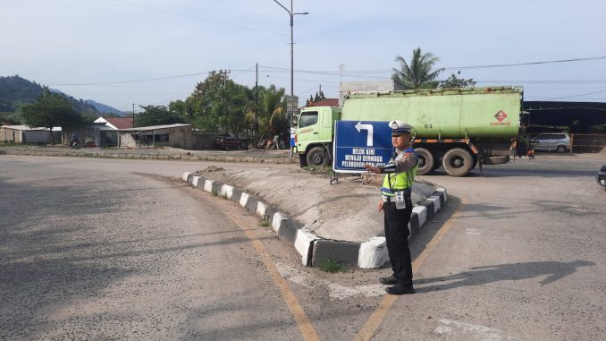 Jelang Arus Balik, Sat Lantas Polresta Bandar Lampung Pasang Rambu Penunjuk Arah Menuju Pelabuhan Panjang