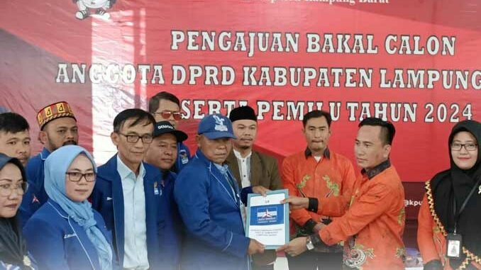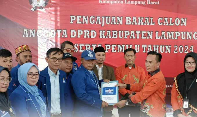 Lampung Barat – Dewan Pimpinan Daerah (DPD) Partai Demokrat Kabupaten Lampung Barat resmi menyerahkan berkas pencalonan anggota legislatif ke kantor Komisi Pemilihan Umum (KPU) setempat. Penyerahan berkas pencalonan itu di terima langsung oleh Ketua KPU Arip Sah beserta komisioner KPU lainnya.