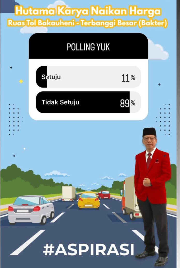 Ia juga mengungkapkan dari sejumlah aspirasi yang dilakukan melalui media sosial Instagram, 89 persen memilih tidak setuju kenaikan toll dilakukan.