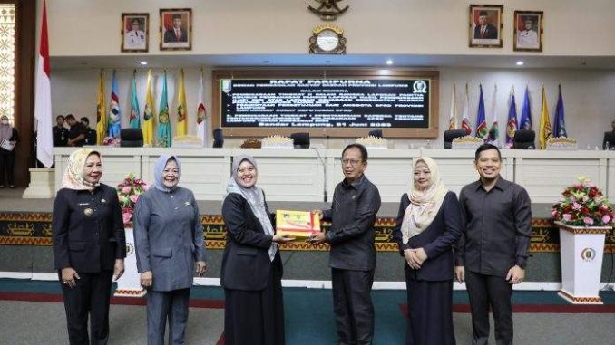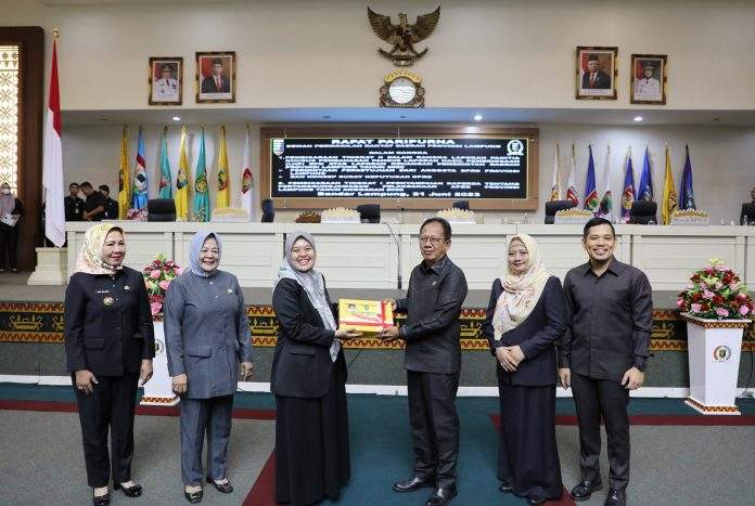 Wakil Gubernur Lampung Chusnunia Chalim (Nunik) menyerahkan dokumen Rancangan Peraturan Daerah (Raperda) Tentang Pertanggungjawaban pelaksanaan APBD Provinsi Lampung Tahun Anggaran 2022 kepada Ketua DPRD Provinsi Lampung Mingrum Gumay dalam Rapat Paripurna DPRD Provinsi Lampung di Ruang Sidang DPRD Provinsi Lampung, Rabu (21/6/2023).