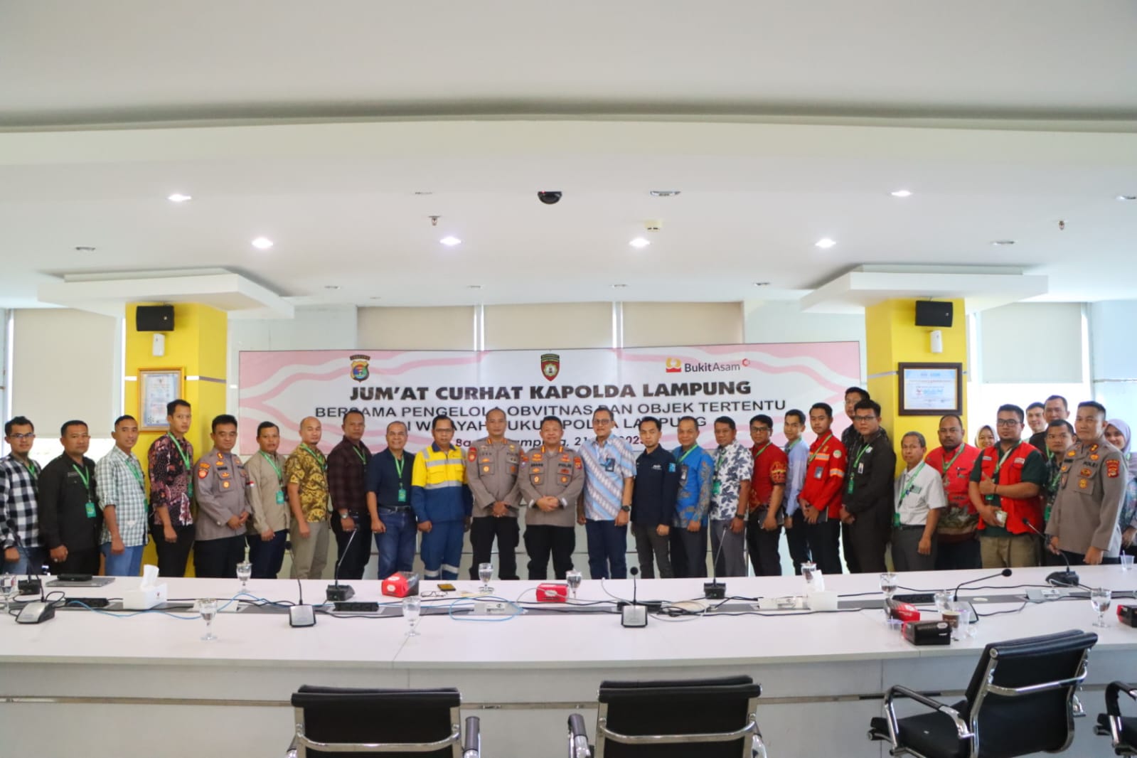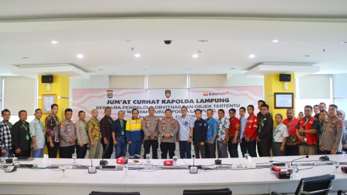 Bertempat di PT. Bukit Asam Persero tarahan Bandar Lampung, Polda Lampung melaksanakan Jum’at Curhat bersama pengelola Obvitnas dan Objek tertentu di wilayah hukum Polda Lampung, Jum’at (21/7/23)