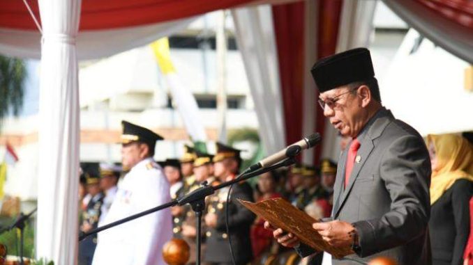 Di hadapan peserta HUT, Mingrum Gumay telihat khidmat dalam membacakan teks proklamasi yang menggugah semangat persatuan dan kesatuan bagi peserta yang mengikuti kegiatan tersebur.