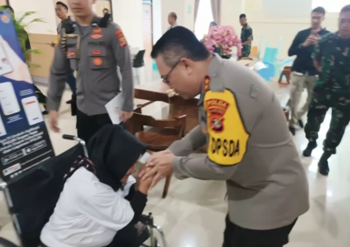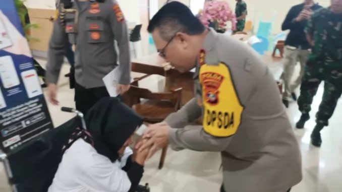 Kapolda Helmy menyempatkan diri menghampiri dan menyalimi seorang wanita duduk di atas kursi roda menunggu pemanggilan nomor atrean. Dalam pertemuan itu, keduanya sempat berkomunikasi ihwal maksud dan tujuan ke datangan ke kantor setempat.