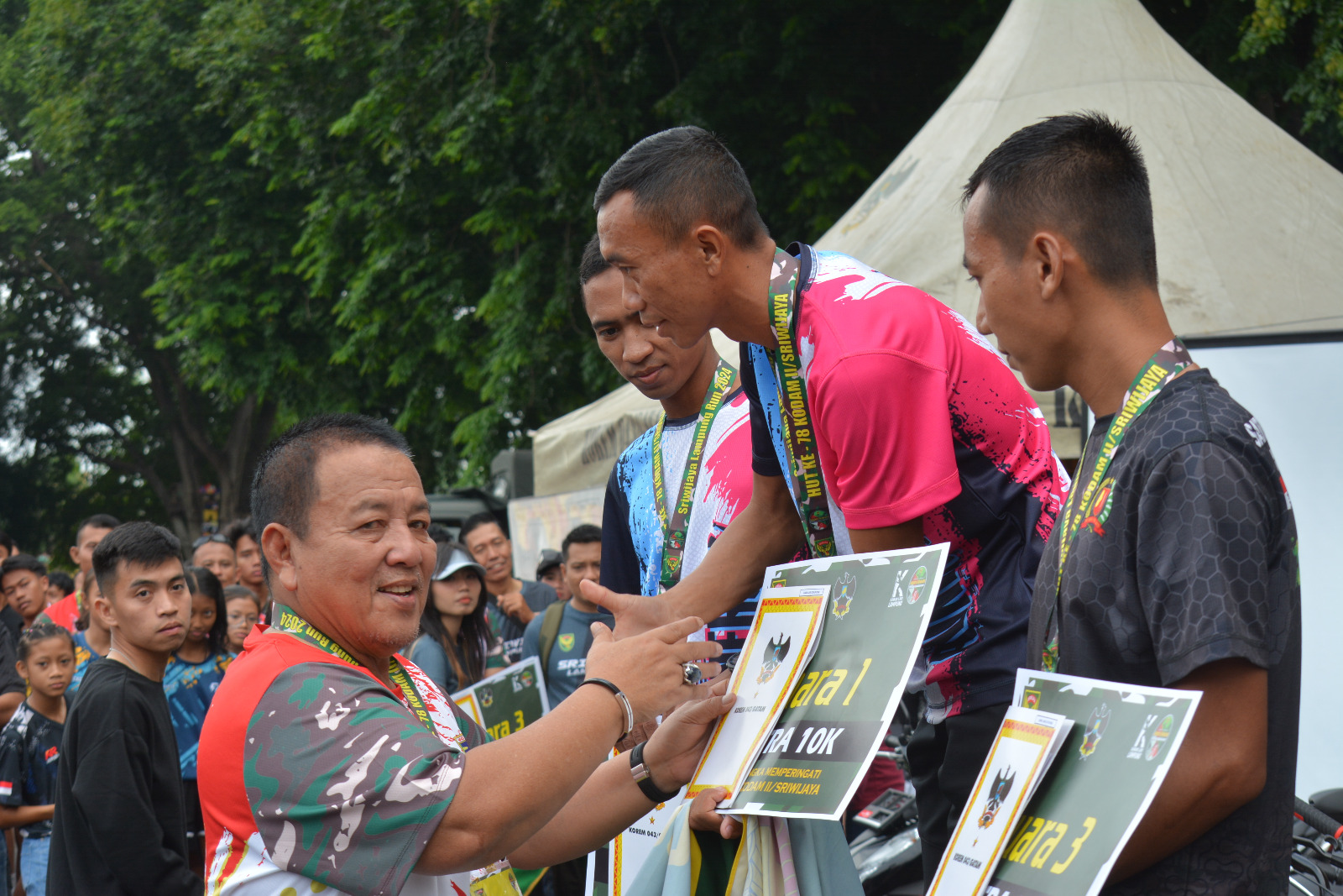 Bandar Lampung, Bertempat di lapangan Enggal Bandar Lampung untuk kesekian kalinya pelari Yonif 143/TWEJ rebut semua kemenangan lari 10K pada lomba Sriwijaya Run yang diselenggarakan oleh Korem 043/Gatam dalam rangka HUT Kodam II/Sriwijaya ke-78. (28/01/2024).