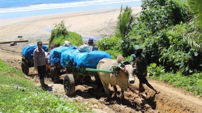Para petugas harus menerjang kondisi medan yang tidak mudah. Dengan menggunakan gerobak ditarik sapi, para petugas ini menyusuri medan sulit mulai dari kondisi jalan yang rusak penuh lumpur hingga harus berjalan dipinggir pantai.