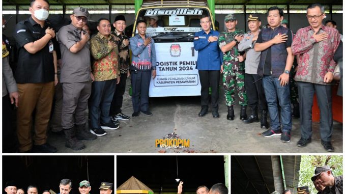 Pesawaran – Bupati Pesawaran Dendi Ramadhona melepas Logistik Pemilu Tahun 2024 di Gudang Logistik KPU Kabupaten Pesawaran Desa Taman sari Kecamatan Gedong Tataan pada Minggu (11/02/2024).