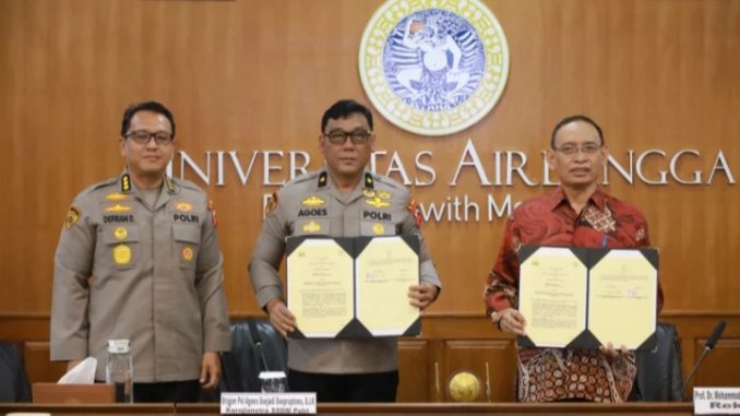 Universitas Airlangga (UNAIR) melakukan penandatanganan Kesepakatan Bersama (MoU) dengan Kepolisian Negara Republik Indonesia (Polri). Kegiatan penandatangan itu berlangsung pada Rabu (24/04/2024) di Ruang Sidang Pleno Balai RUA, Kantor Manajemen, Kampus MERR-C.