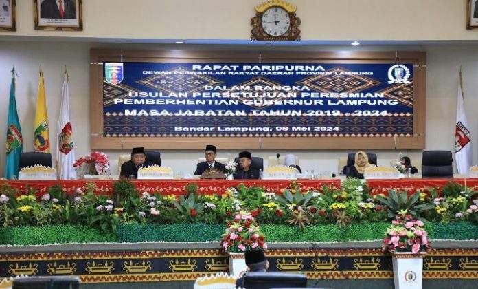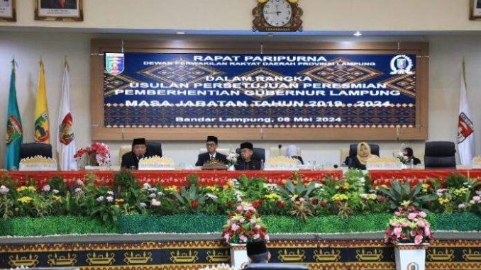 Paripurna tentang Pemberhentian Gubernur Masa Jabatan 2019-2024 telah digelar di Ruang Sidang Dewan Perwakilan Rakyat Daerah (DPRD) Provinsi Lampung, Rabu (8/5/2024).