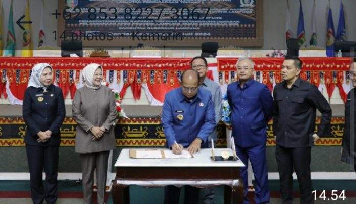 Pj. Gubernur Lampung Samsudin dan Ketua DPRD Provinsi Lampung Mingrum Gumay menandatangani Rancangan Peraturan Daerah (Raperda) tentang Pertanggungjawaban Pelaksanaan APBD Provinsi Lampung Tahun Anggaran 2023, bertempat di Ruang Sidang DPRD Provinsi Lampung, Bandar Lampung, Rabu (31/7/2024).