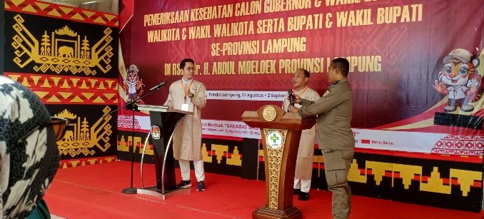 Bandar Lampung, – Raditya Egi Pratama dan M Syaiful Anwar yang merupakan pasangan bakal calon (Paslon) Bupati dan Wakil Bupati Lampung Selatan lakukan pemeriksaan kesehatan di Rumah Sakit Abdoel Moeloek (RSUD AM). Senin (02/09/2024).