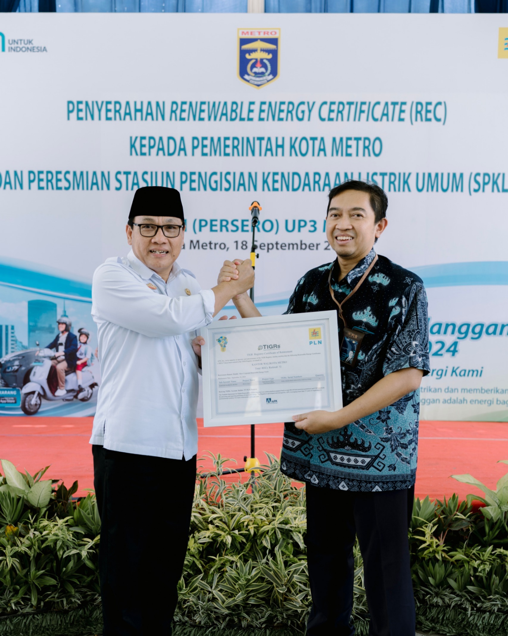 Metro, 19 September 2024 – PT PLN (Persero) Unit Induk Distribusi (UID) Lampung terus bersinergi dengan Pemerintah Kabupaten/Kota di Provinsi Lampung dalam mendukung penggunaan Energi Baru Terbarukan (EBT). Hal ini diwujudkan dengan penyerahan Renewable Energy Certificate (REC) kepada Pemerintah Kota Metro yang kini secara resmi telah menjadi pemerintah daerah pertama di Lampung yang menggunakan 100 persen energi bersih.