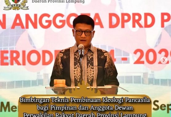 Ketua Sementara DPRD Provinsi Lampung Bapak Ahmad Giri Akbar, SE., M.B.A memberikan sambutan dalam Pembukaan Bimtek Pembinaan ideologi Pancasila, hadir juga Wakil Ketua Sementara DPRD Provinsi Lampung Ibu Kostiana, SE., MH., yang dibuka secara resmi oleh Direktur Sosialisasi dan Komunikasi BPIP RI Prof. Dr. Agus Moh. Najib S.Ag., M.Ag., Dalam pembukaan acara tersebut telah dilaksanakan penandatangan Perjanjian Kerjasama BPIP RI yang ditandatangani oleh Sekretaris DPRD Provinsi Lampung Ibu Hj. Tina Malinda, S.Sos. MM. dan Direktur Hubungan antar lembaga dan Kerjasama BPIP RI Bapak M. Akbar Hadi Prabowo, SH. MH., Bimtek PIP dengan tema “Pemahaman Ideologi Pancasila” diikuti oleh 84 Anggota DPRD Provinsi Lampung Masa Jabatan 2024 – 2029.