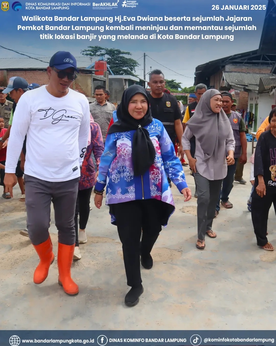 Walikota Bandar Lampung Hj.Eva Dwiana beserta sejumlah Jajaran Pemkot Bandar Lampung kembali meninjau dan memantau sejumlah titik lokasi banjir yang melanda di Kota Bandar Lampung, Minggu (26/1/2025).
