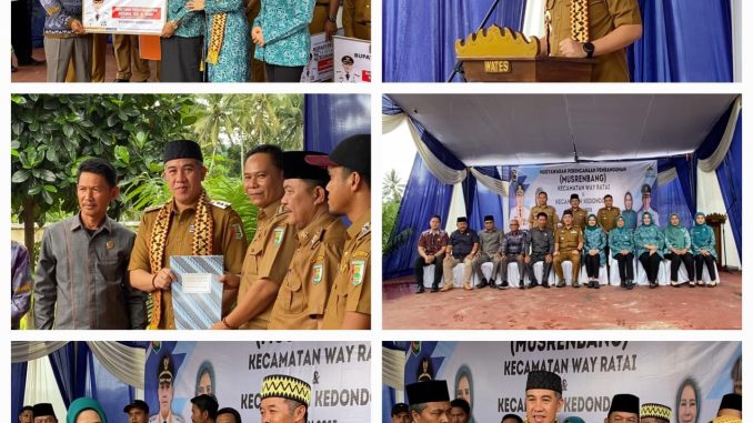 Pesawaran, 18 Februari 2025 – Bupati Pesawaran Dendi Ramadhona, menghadiri Musyawarah Perencanaan Pembangunan (Musrenbang) Kecamatan Way Ratai dan Kedondong dalam rangka penyusunan Rencana Kerja Pembangunan Daerah (RKPD) Tahun 2026. Kegiatan ini berlangsung di Saung Singgah Desa Wates, Kecamatan Way Ratai, pada Selasa (18/2/2025) dan dihadiri oleh Ketua dan Wakil Ketua TP PKK, Asisten Ekobang, para Kepala Perangkat Daerah, Kepala Bagian, Camat Kedondong, Camat Way Ratai, serta para kepala Desa dari kecamatan terkait.