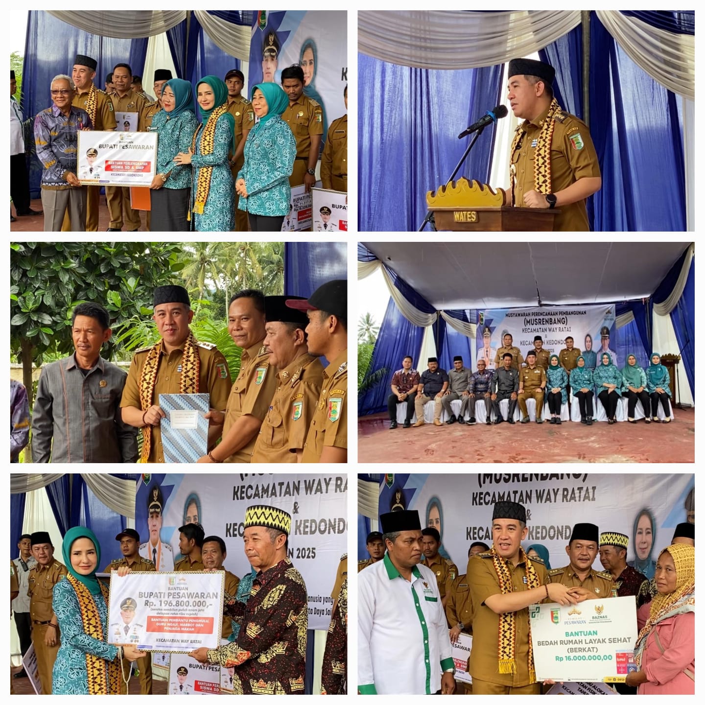 Selain memberikan arahan, pada kesempatan tersebut Bupati juga turut memberikan bantuan bagi penghulu, guru ngaji, marbot dan penjaga makam, bantuan perlengkapan siswa SD dan SMP, pagu alokasi kegiatan fisik/non fisik, serta pagu dana desa dan alokasi dana desa untuk Kecamatan Way Ratai. Selain itu Bupati juga turut menyerahkan pagu dana desa dan alokasi dana desa tahun 2025 untuk Kecamatan Kedondong serta bantuan Bedah Rumah Layak Sehat (Berkat) dari Baznas Pesawaran.