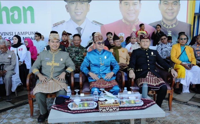 Pemerintah Provinsi Lampung bersama DPP Lampung Sai dan Majelis Penyimbang Adat Lampung (MPAL) menggelar tradisi masyarakat Lampung Blangikhan di Kolam Renang Pahoman, Bandar Lampung, Jum’at (28/2/2025).