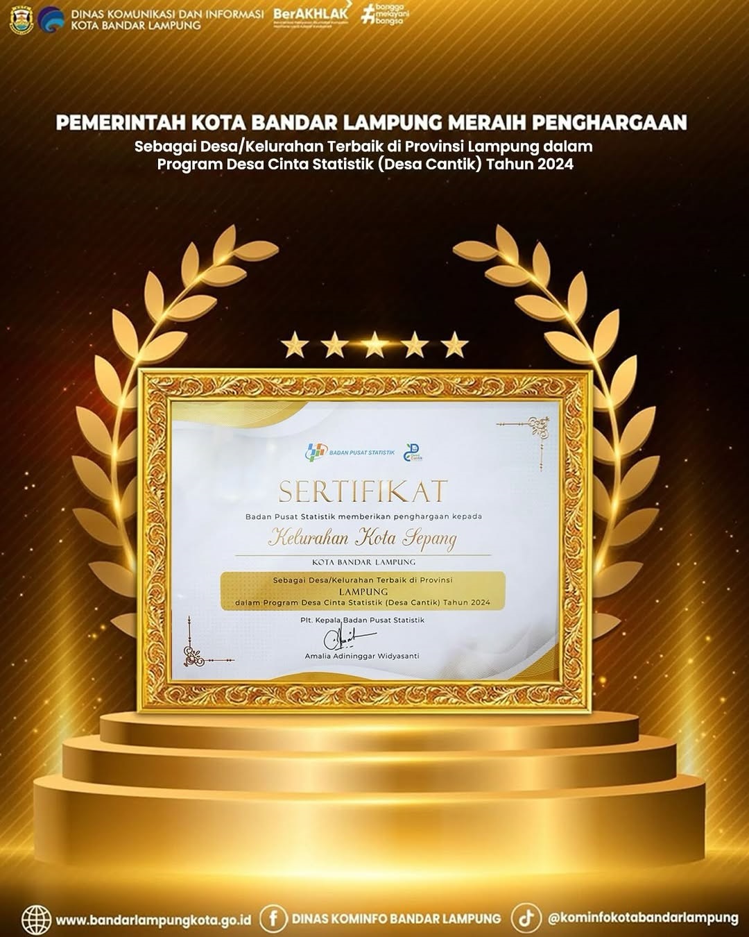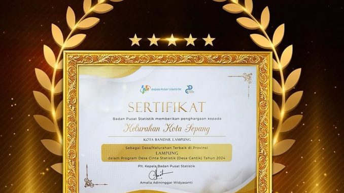 Pemerintah Kota Bandar Lampung Meraih Penghargaan sebagai Desa/Kelurahan Cantik terbaik di Provinsi Lampung dalam program desa Cinta Statistik (Desa Cantik) Tahun 2024.