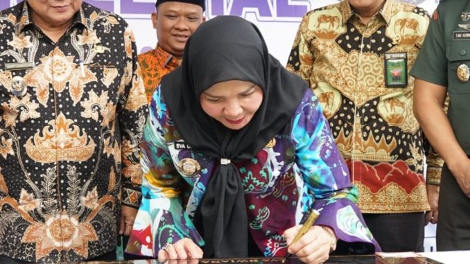 Walikota Bandar Lampung, Hj. Eva Dwiana bersama Wakil Walikota Bandar Lampung Drs. Hi Deddy Amarullah dan Forkopimda Kota Bandar Lampung menekan tombol dan pengguntingan pita tanda diresmikannya JPO Siger Milenial.