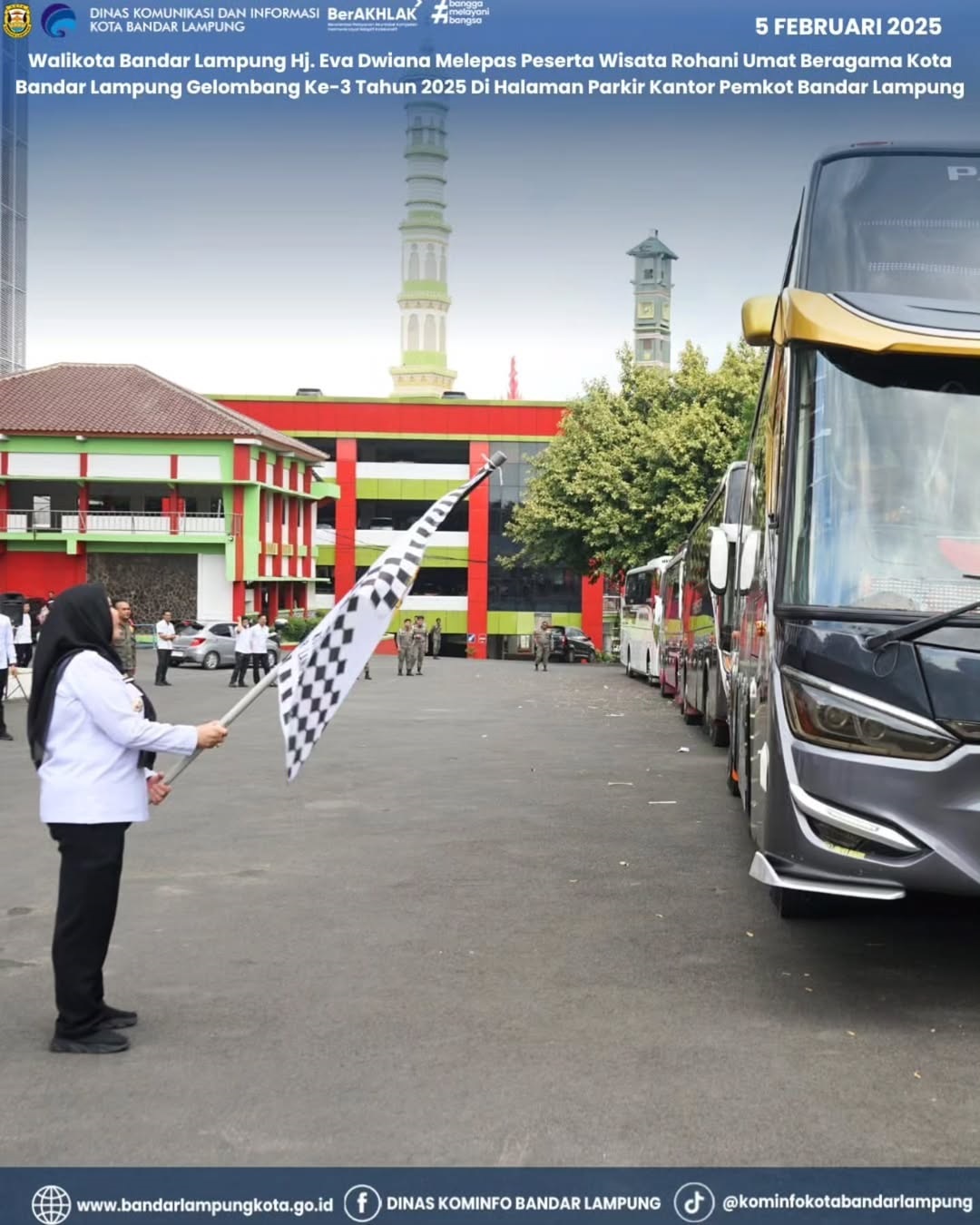 Walikota Bandar Lampung Hj. Eva Dwiana Melepas Peserta Wisata Rohani Umat Beragama Kota Bandar Lampung Gelombang Ke-3 Tahun 2025 Di Halaman Parkir Kantor Pemkot Bandar Lampung.