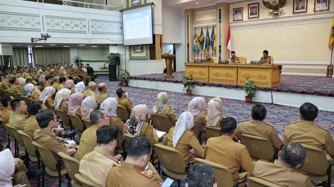 BANDARLAMPUNG — Gubernur Lampung, Rahmat Mirzani Djausal dan Wakil Gubernur Lampung, Jihan Nurlela lakukan briefing perdana bersama seluruh Kepala Organisasi Perangkat Daerah di Lingkungan Pemerintah Provinsi Lampung, di Balai Keratun Lt.3, Kantor Gubernur Lampung, Senin (03/03/2025).