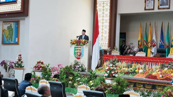 Bandar Lampung —- Gubernur Lampung, Rahmat Mirzani Djausal, didampingi Wakil Gubernur Jihan Nurlela menyampaikan pidato perdananya dalam Rapat Paripurna Istimewa DPRD Provinsi Lampung, Selasa (4/3/2025).