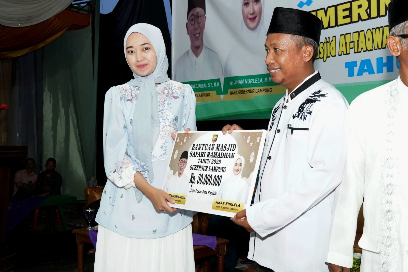 Dalam kesempatan tersebut, Wakil Gubernur Jihan juga menyerahkan sejumlah bantuan diantaranya santunan anak yatim, bantuan kepada Lansia dan bantuan untuk Masjid. (Dinas Kominfotik Provinsi Lampung).