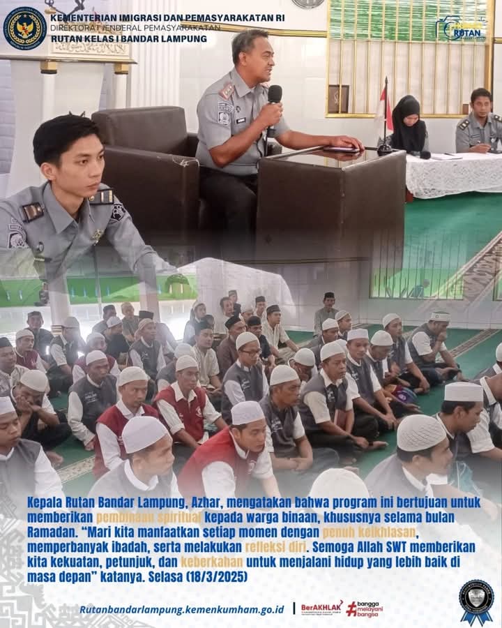 Kepala Rutan Bandar Lampung, Azhar, mengatakan bahwa program ini bertujuan untuk memberikan pembinaan spiritual kepada warga binaan, khususnya selama bulan Ramadan. “Mari kita manfaatkan setiap momen dengan penuh keikhlasan, memperbanyak ibadah, serta melakukan refleksi diri. Semoga Allah SWT memberikan kita kekuatan, petunjuk, dan keberkahan untuk menjalani hidup yang lebih baik di masa depan” katanya. Selasa (18/3/2025)