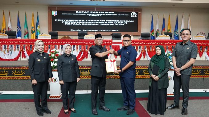 Bandar Lampung — Gubernur Lampung Rahmat Mirzani Djausal menyampaikan Laporan Keterangan Pertanggungjawaban (LKPJ) Kepala Daerah Tahun Anggaran 2024 dalam Rapat Paripurna DPRD Provinsi Lampung yang digelar di Ruang Sidang Paripurna, Senin (14/4/2025).