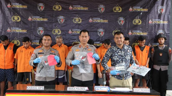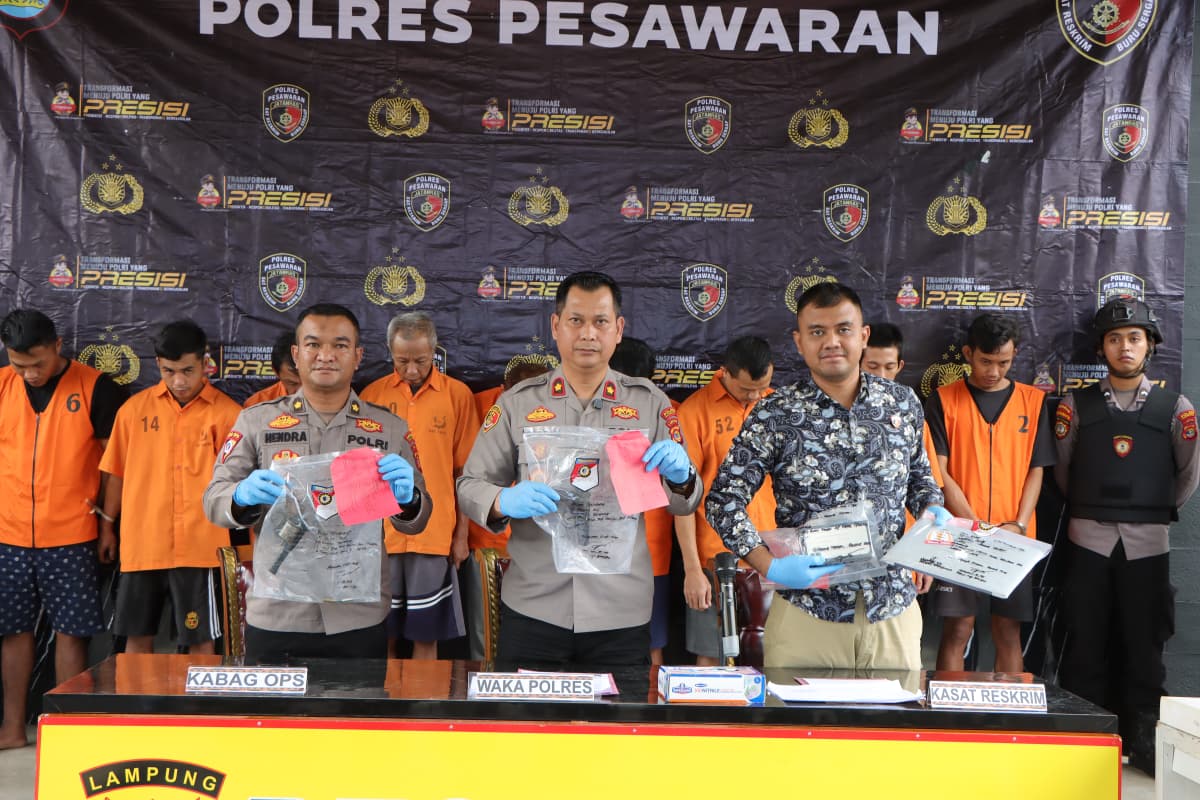 PESAWARAN – Polres Pesawaran, Polda Lampung, berhasil mengungkap 13 kasus tindak pidana sepanjang Agustus 2025 dengan mengamankan 9 tersangka. Hal ini dipaparkan dalam press release di Mapolres Pesawaran, Jumat (22/8/2025), yang dipimpin Wakapolres Kompol Sugandhi Satria Nugraha, S.I.P., M.H., mewakili Kapolres AKBP Heri Sulistyo Nugroho, S.I.K., M.I.K., bersama Kabag Ops Kompol Hendra Gunawan, S.H., M.H., dan Kasat Reskrim Iptu Pande Putu Yoga M. S.Tr.K., M.H.