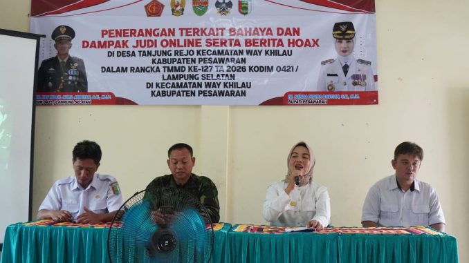 Pesawaran, 25 Februari 2026 — Dinas Komunikasi, Informatika, Statistik dan Persandian (Diskominfotiksan) Kabupaten Pesawaran turut ambil bagian dalam kegiatan nonfisik TNI Manunggal Membangun Desa (TMMD) ke-127 yang dilaksanakan oleh Kodim 0421/Lampung Selatan. Kegiatan berupa sosialisasi bahaya judi online dan penyebaran hoaks tersebut digelar di Balai Desa Tanjung Rejo, Kecamatan Way Khilau, Rabu (25/2/2026).
