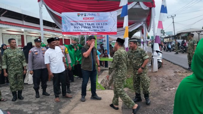 JATI AGUNG–Dandim 0421/Lampung Selatan Letkol Kav Nuril Ambiyah, S.H., M.I.P, menghadiri kegiatan Bazar Sembako Murah dan Berbagi Takjil dalam rangka menyemarakkan Bulan Suci Ramadhan 1447 H yang dilaksanakan di lokasi KDKMP Desa Marga Agung, Kecamatan Jati Agung. Lampung Selatan. Sabtu (28/02/2026).